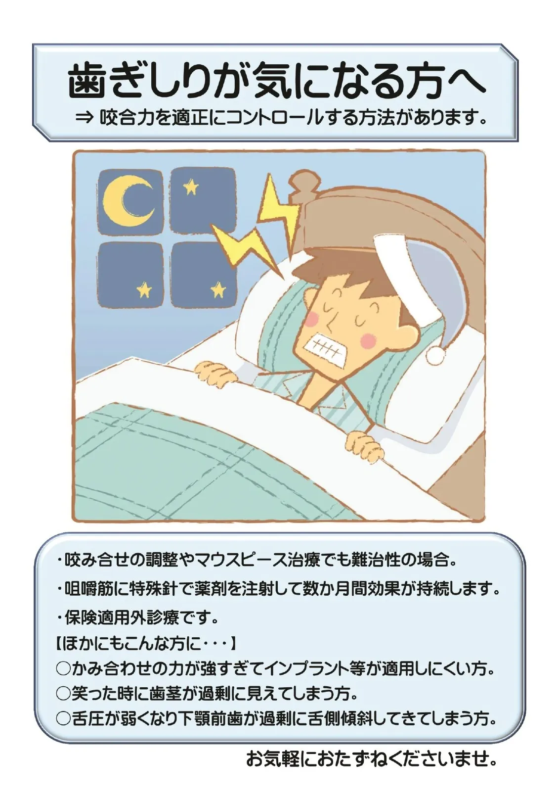 咬み合わせの調整やマウスピースでも効果が不十分な方に咀嚼筋(咬筋など)に特殊な針で薬剤を注射、効果は数か月間持続し、継続治療も可能です。
